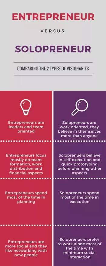 Well the main difference between solopreneurs and entrepreneurs is that they love to do what they work. They may not have same MINDSET but their way is same. Entrepreneurs are true leaders they have great leadership skills due to which they form perfect team and makes work more easier they are team oriented. Solopreneurs are work oriented they aren’t dependent on someone except their clients. Entrepreneurs have large social network as compared to solopreneurs. Entrepreneurs have to spend on their team as well but as solopreneurs dont have any kind of team the probability of earning is higher.